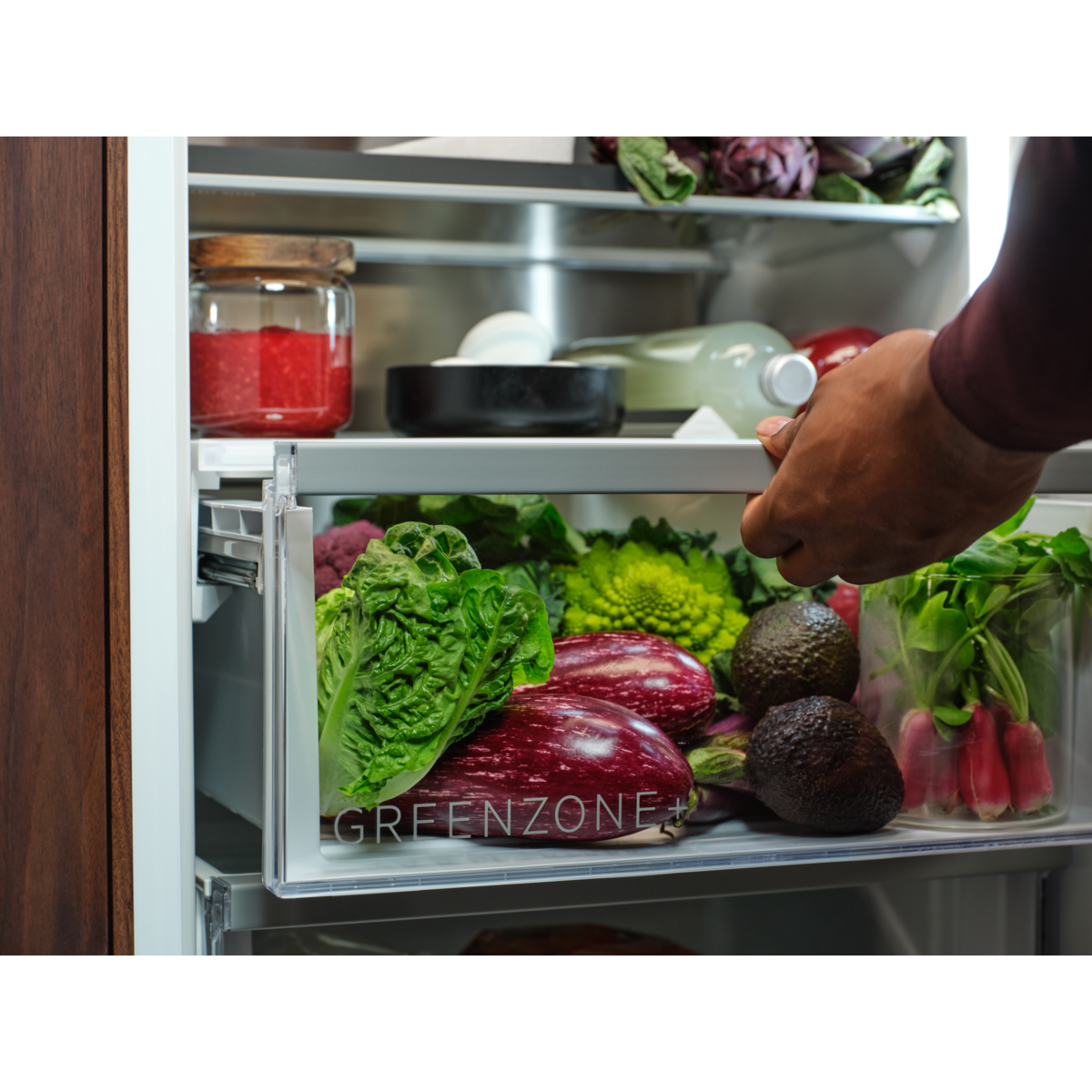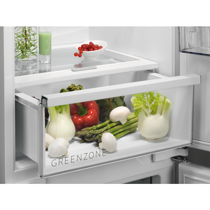 Выдвижной ящик GreenZone устраняет излишнюю влажность, сохраняя при этом необходимое количество влаги для овощей. Это позволяет сохранить до 95 % витаминов через 11 дней, защищая продукты при правильной влажности.